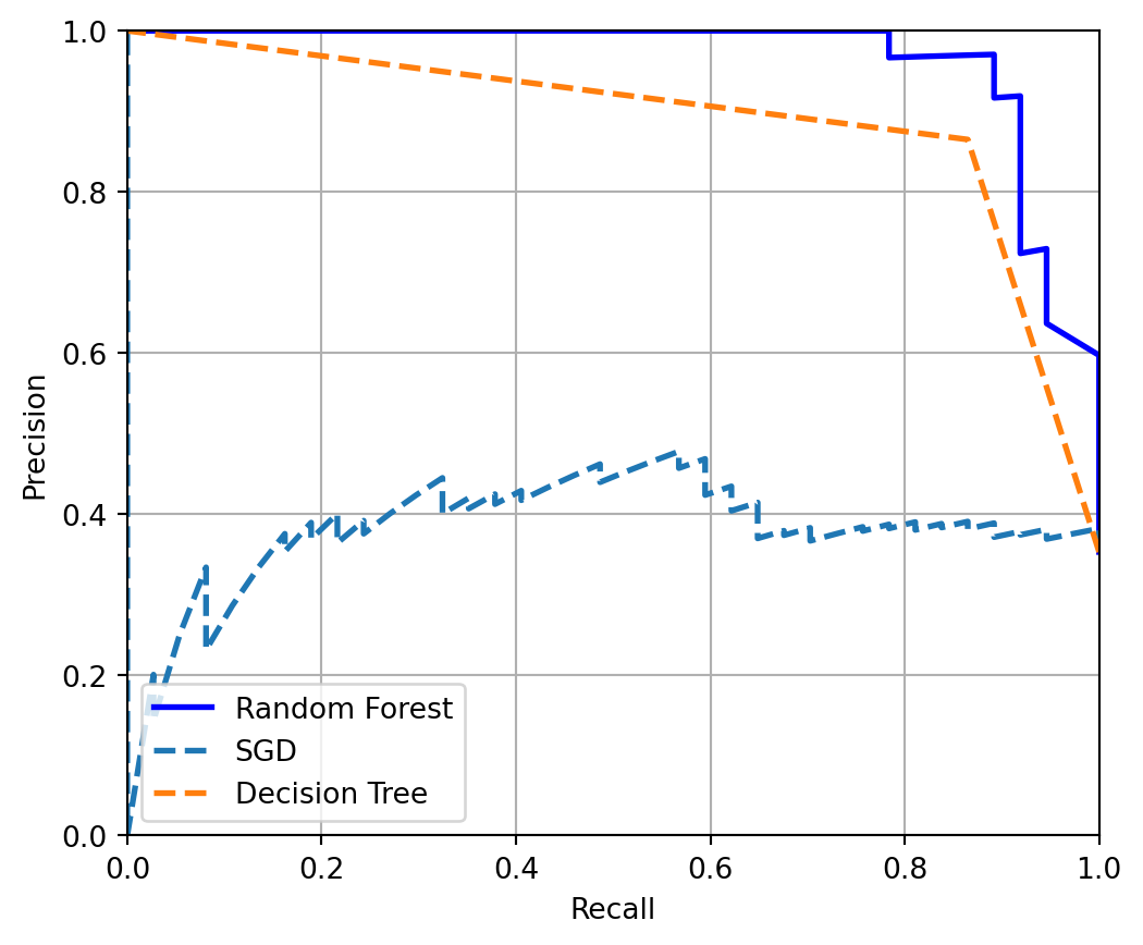 SGD (dashed line): The performance of the SGD model varies more than the Random Forest. Its precision starts lower and fluctuates as recall increases. This suggests that the model may not be as reliable in its positive predictions compared to the Random Forest.