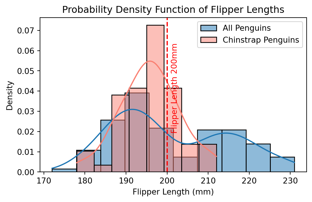import matplotlib.pyplot as pltplt.figure(figsize=(6, 3.5))# Plot for all penguinssns.histplot(all_flipper_data, kde=True, stat="density", label='All Penguins')# Plot for Chinstrap penguinssns.histplot(chinstrap_data, kde=True, stat="density", color='salmon', label='Chinstrap Penguins')plt.axvline(x=flipper_length, color='red', linestyle='--')plt.text(flipper_length+1, 0.02, f'Flipper Length {flipper_length}mm', rotation=90, color='red')plt.title('Probability Density Function of Flipper Lengths')plt.xlabel('Flipper Length (mm)')plt.ylabel('Density')plt.legend()plt.show()